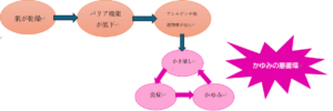 肌が乾燥するとバリア機能が低下し、アレルゲンや刺激物質が侵入します。すると、かきこわしや炎症、かゆみなどの症状が出てきます。
